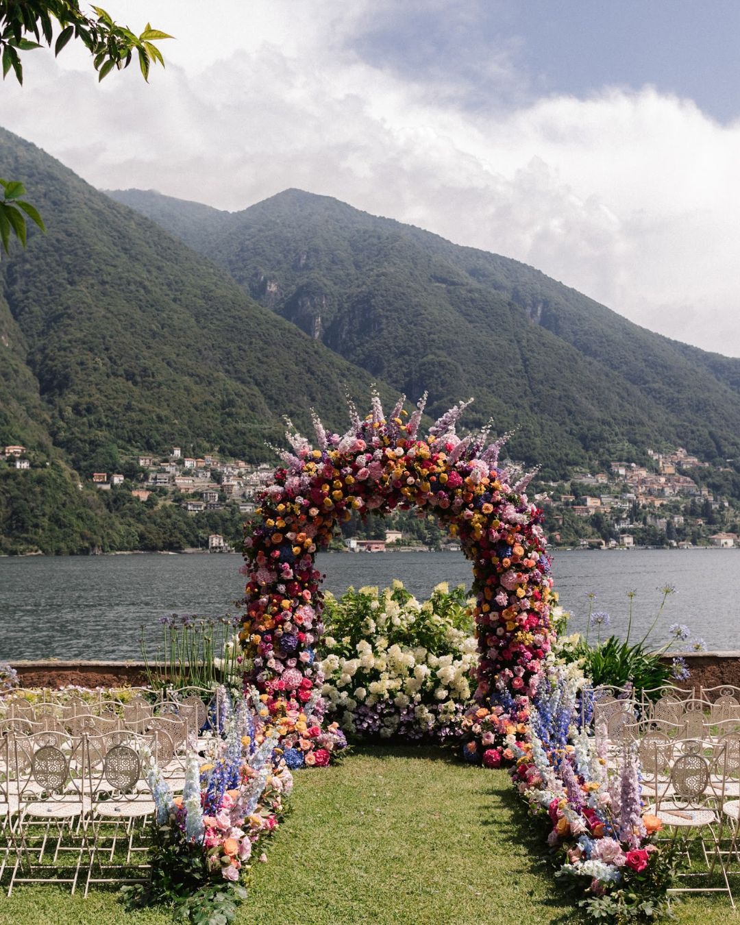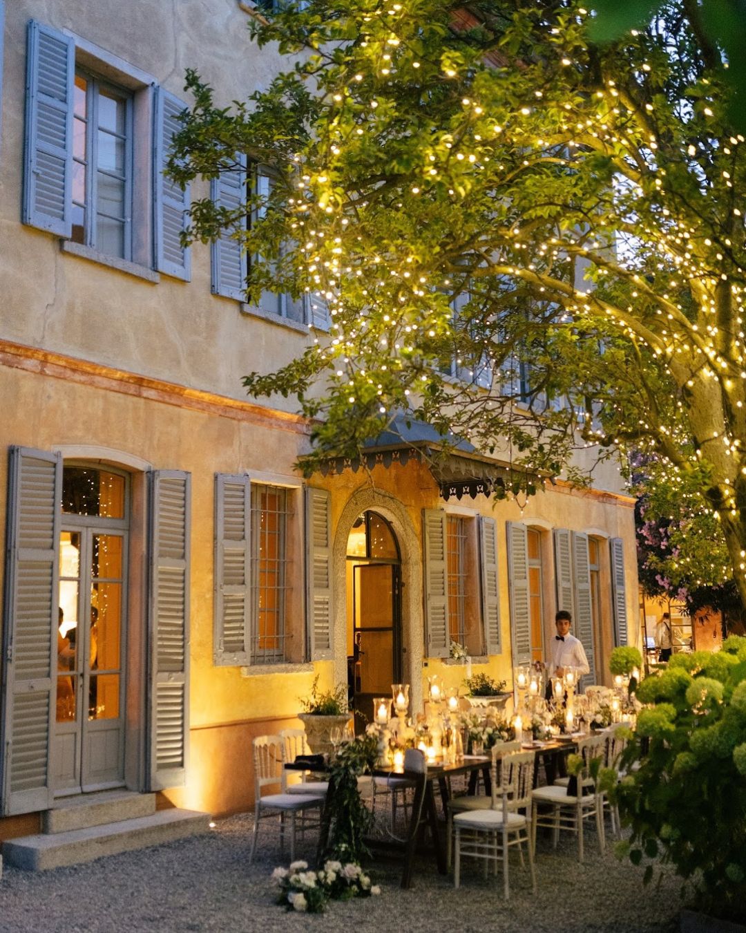 One of the villa’s most iconic features? Its private dock, where guests (or even the bride and groom!) can arrive by boat—because nothing says Lake Como quite like a water arrival. As the evening sets in, the upper terrace glows with twinkling fairy lights, creating the perfect setting for an elegant and romantic outdoor dinner reception.